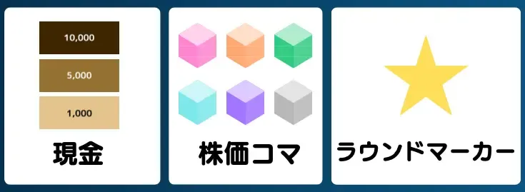 ゲーム内で使用する通貨です。10,000、5,000、1,000の3種類があります。プレイヤーはこれを使って株券を購入していきます。株価コマ